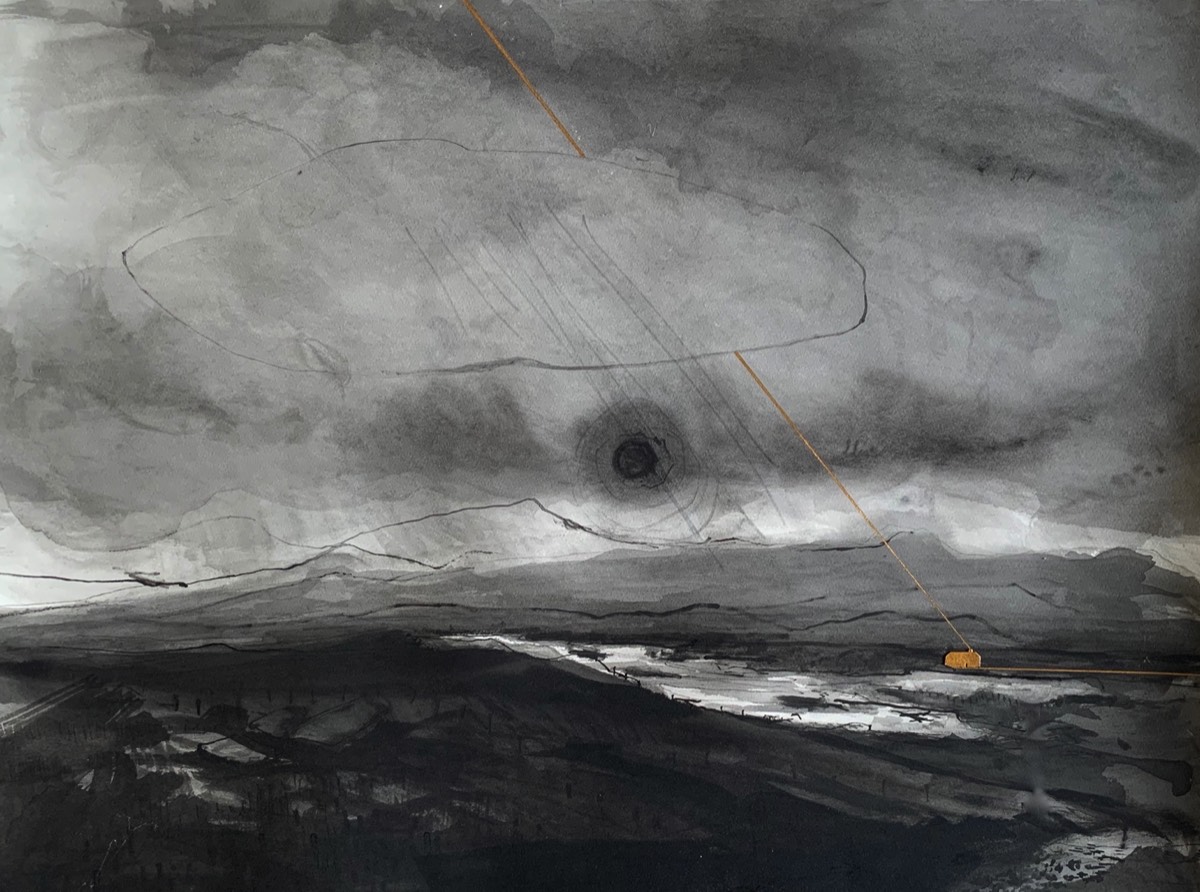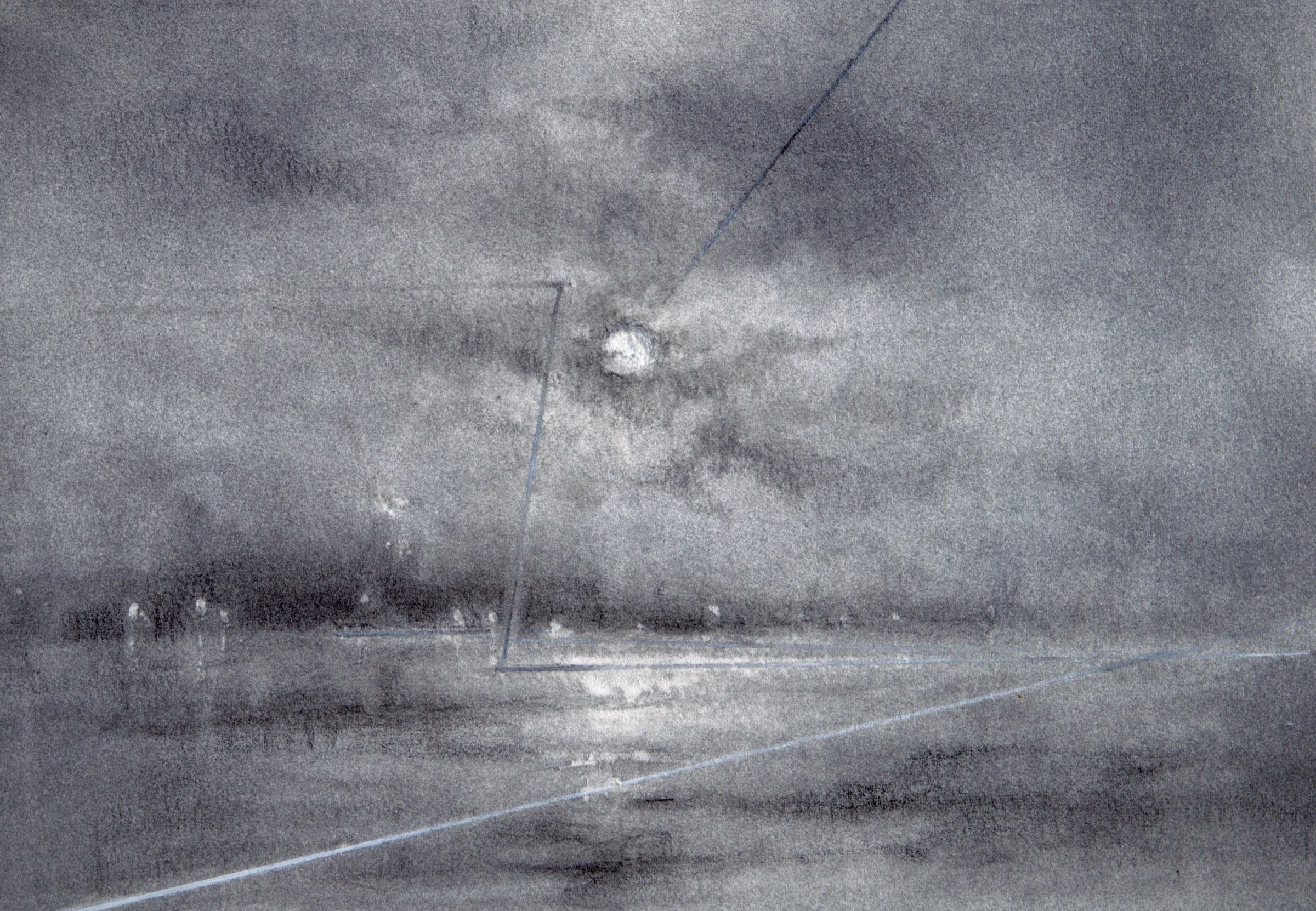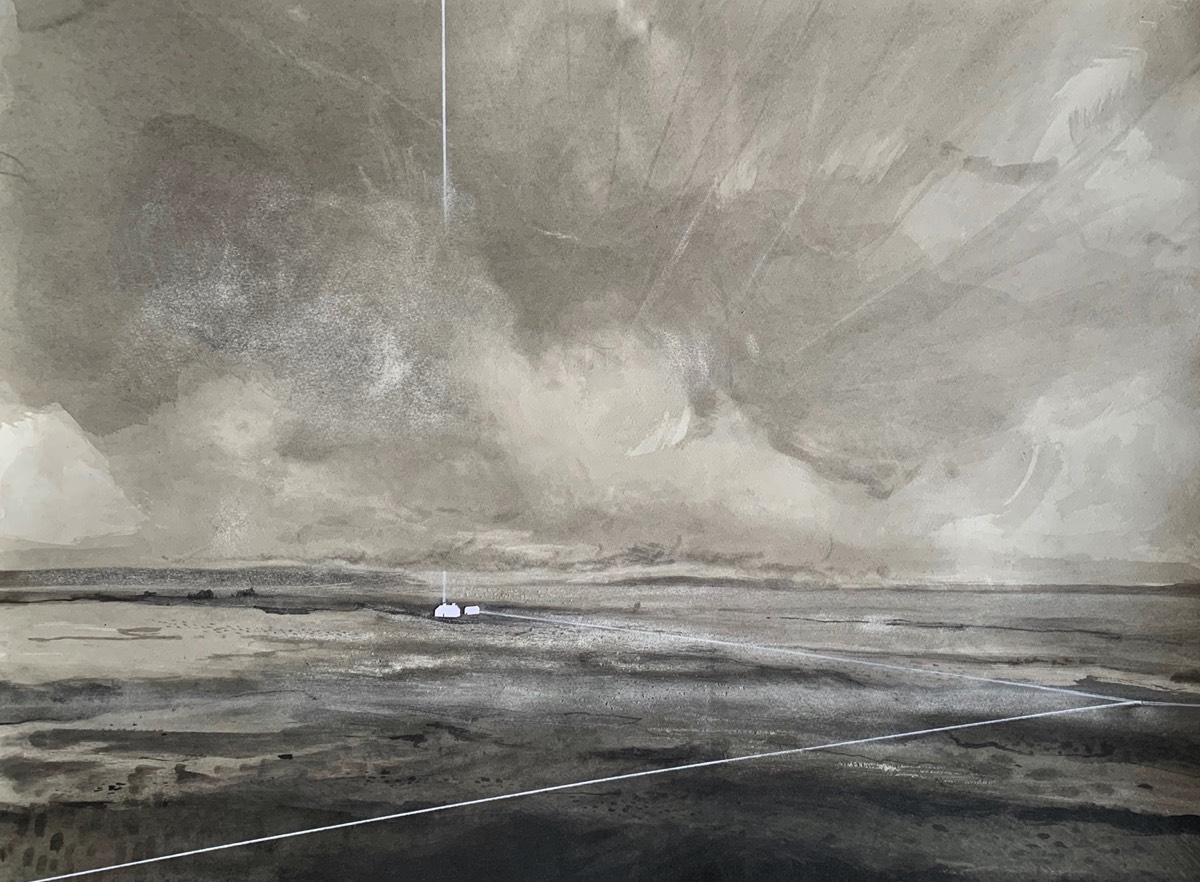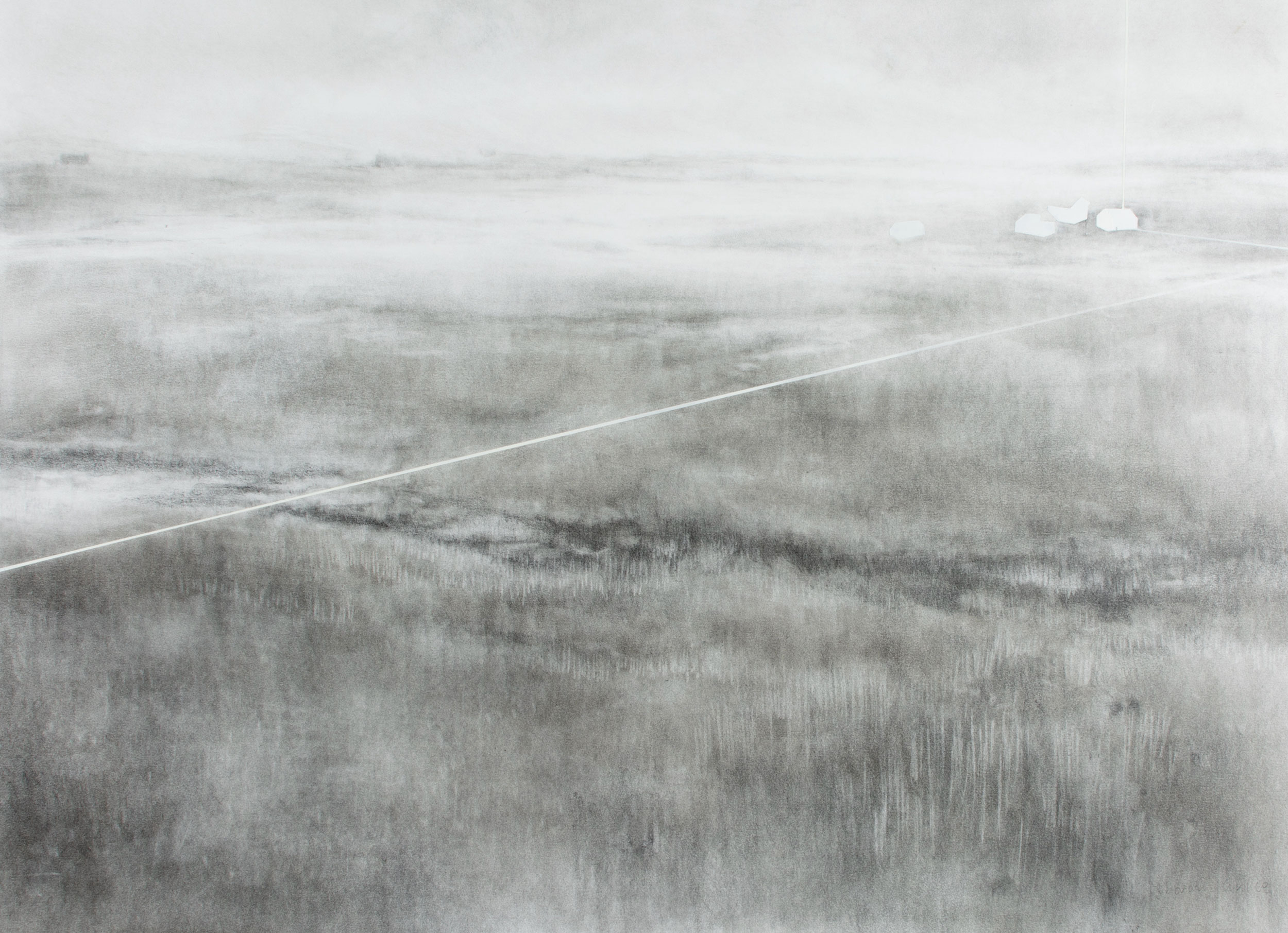 My drawings are developed in the studio from en-plein air pieces. I work in the field, assimilating as much information as possible, be in geography, atmosphere or weather. Once back in the studio I scale up my preliminary drawings and being to add abstract architectural design elements, to add tension and narrative to my work. I use a variety of mediums: from ink, charcoal and carbon powder, gold paste to collage alongside a selection of different erasers and 'rubbing back' methods.