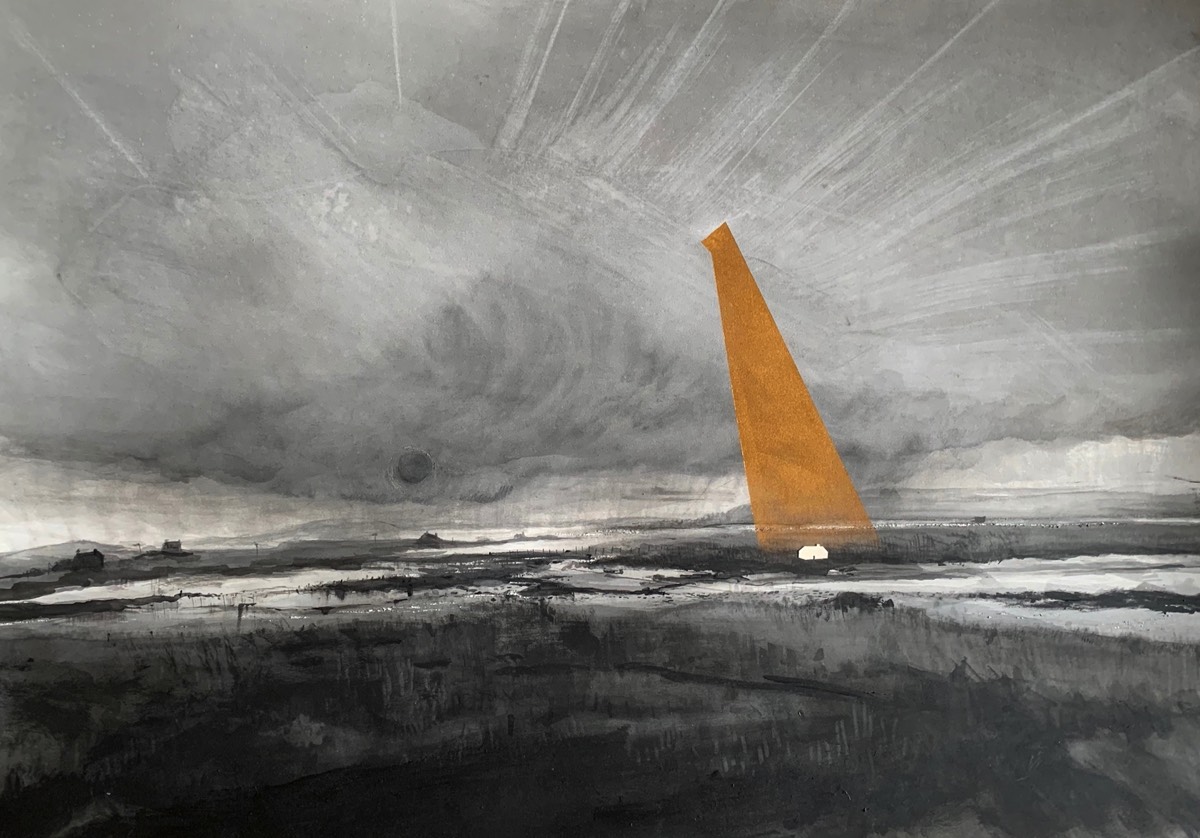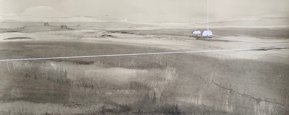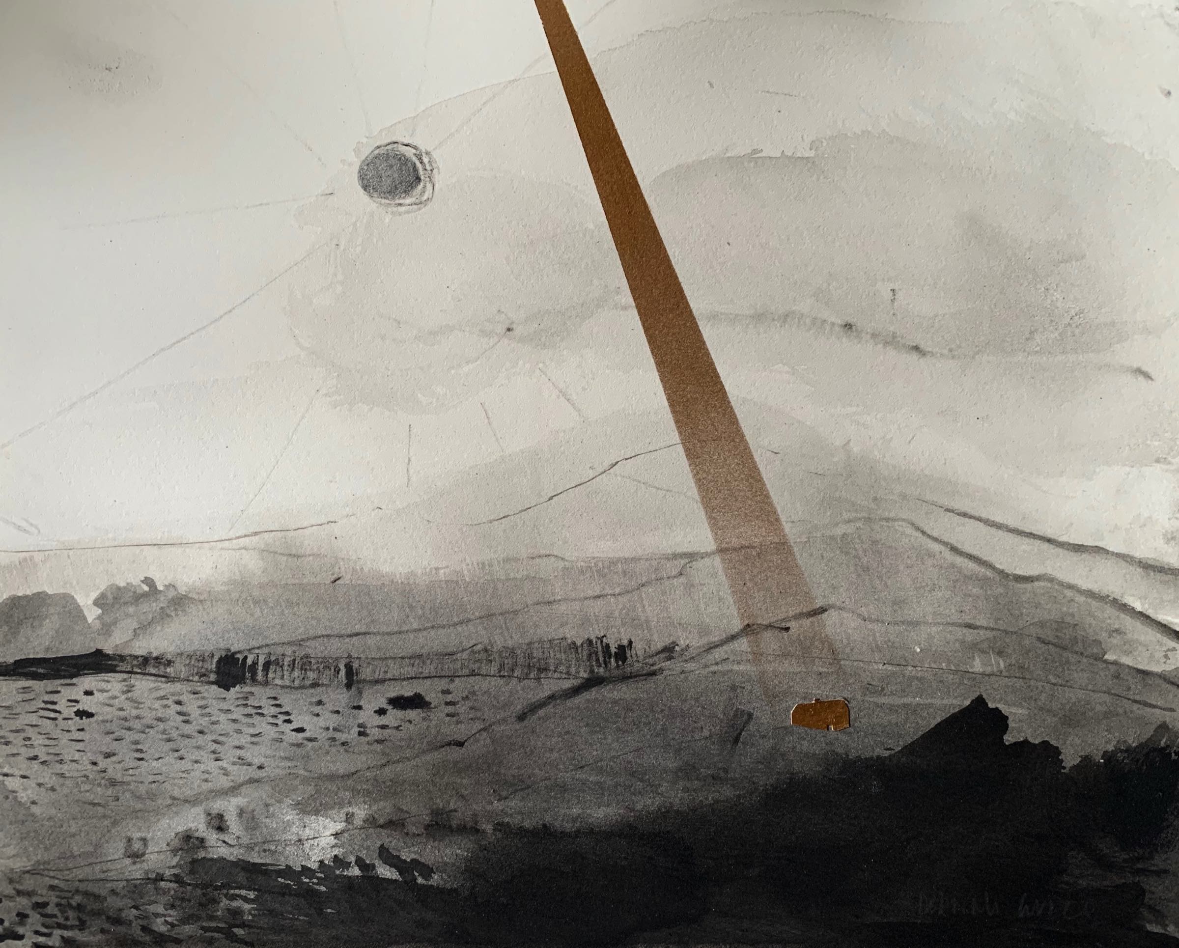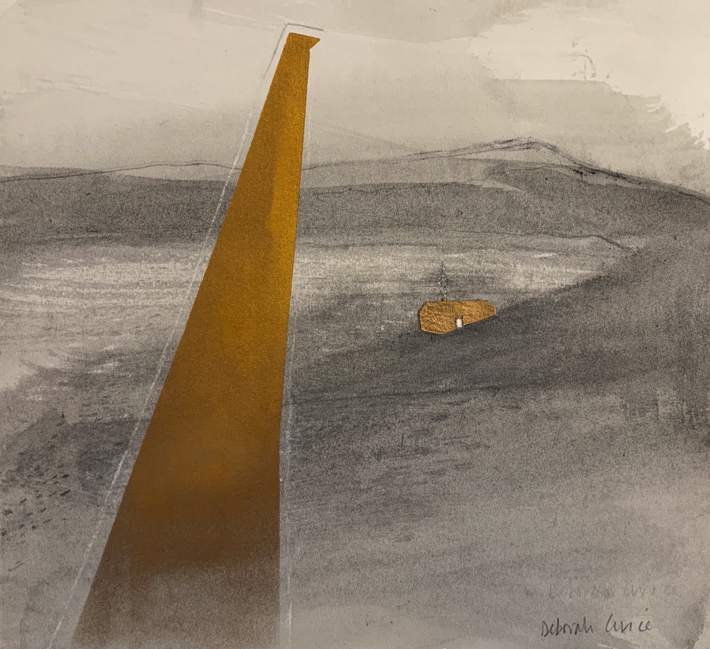 My drawings are developed in the studio from en-plein air pieces. I work in the field, assimilating as much information as possible, be in geography, atmosphere or weather. Once back in the studio I scale up my preliminary drawings and being to add abstract architectural design elements, to add tension and narrative to my work. I use a variety of mediums: from ink, charcoal and carbon powder, gold paste to collage alongside a selection of different erasers and 'rubbing back' methods.