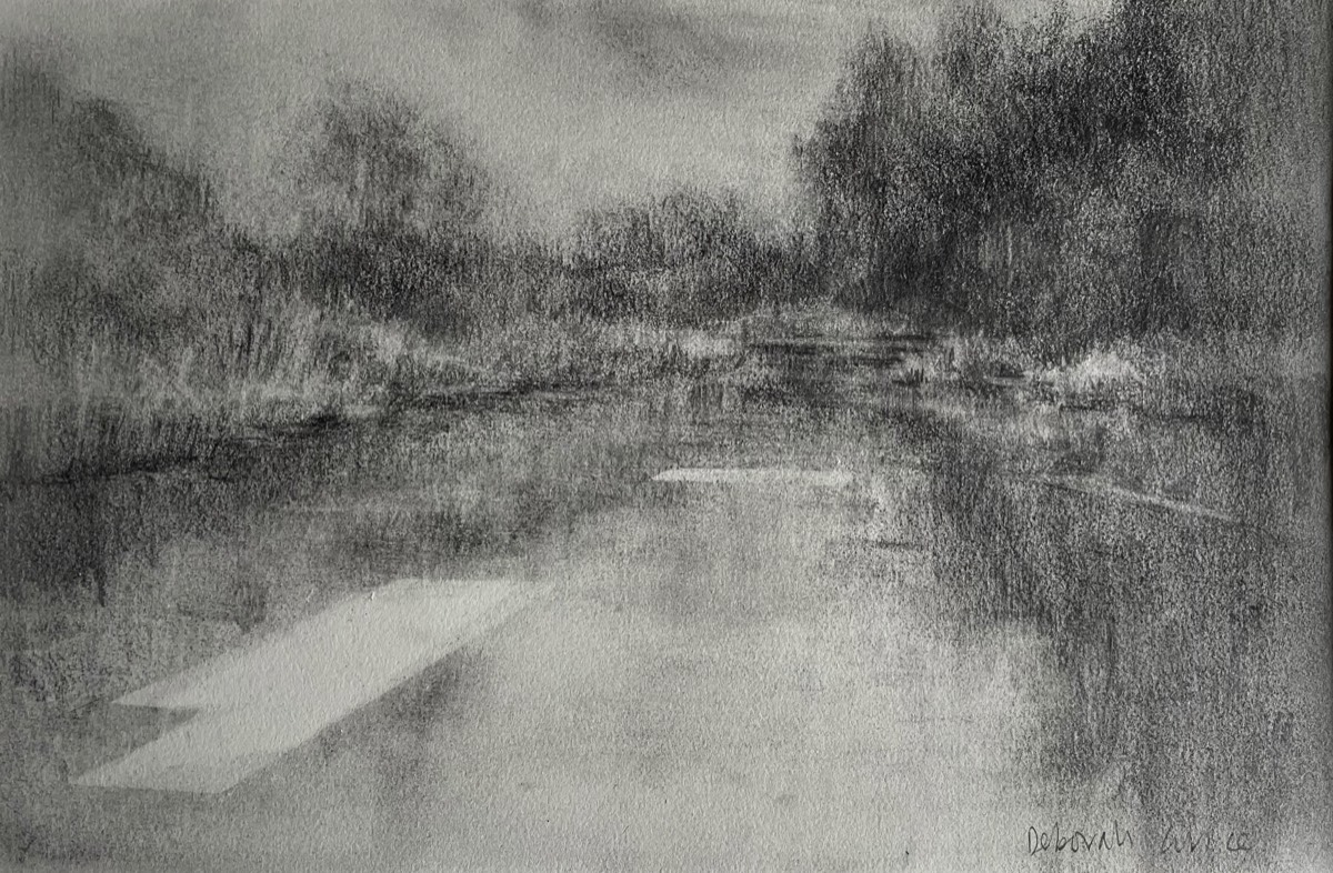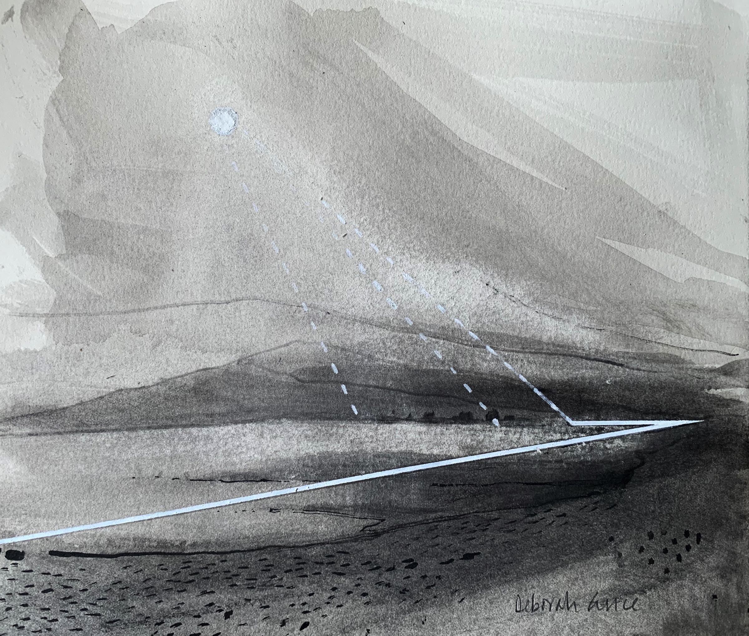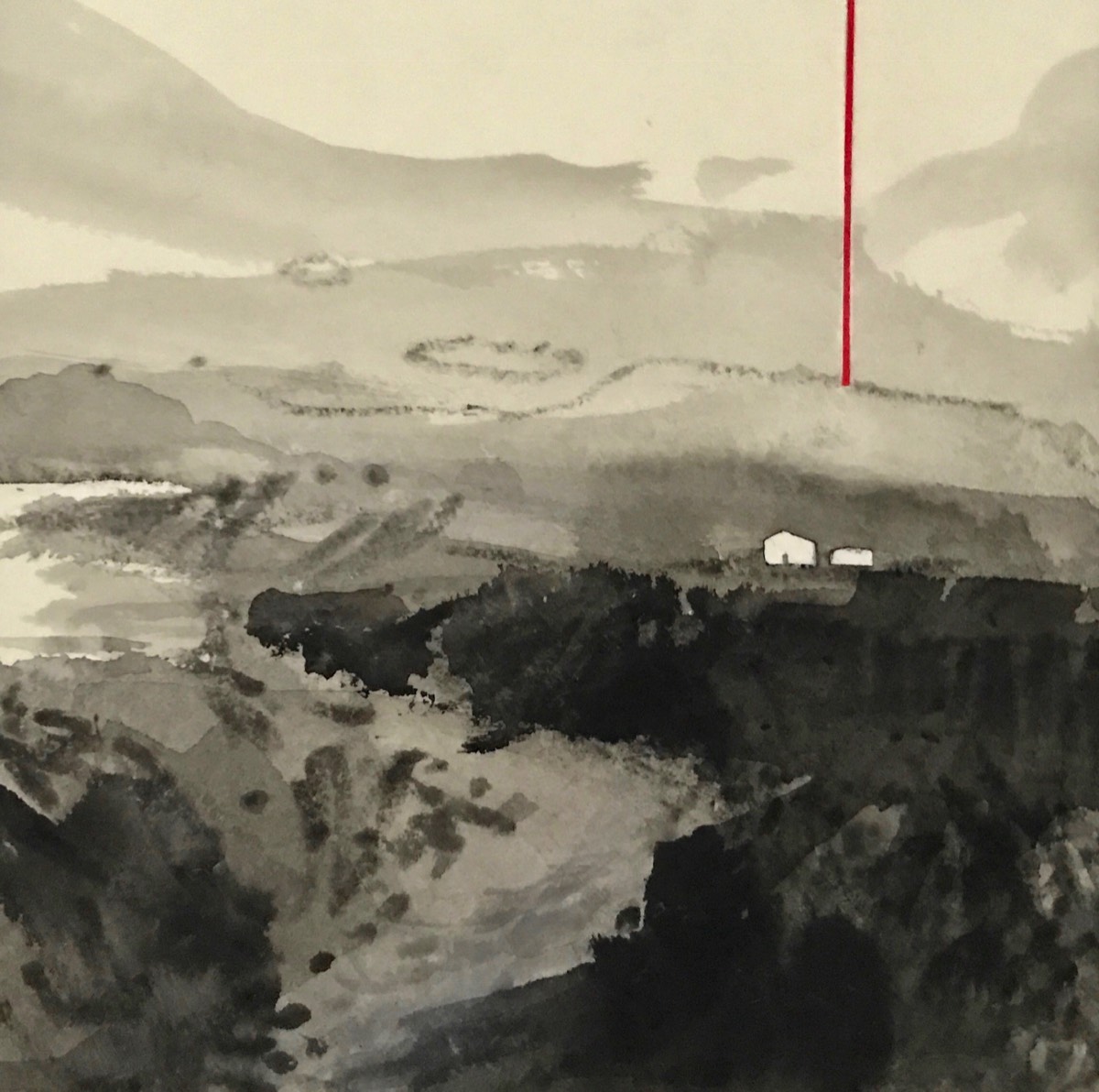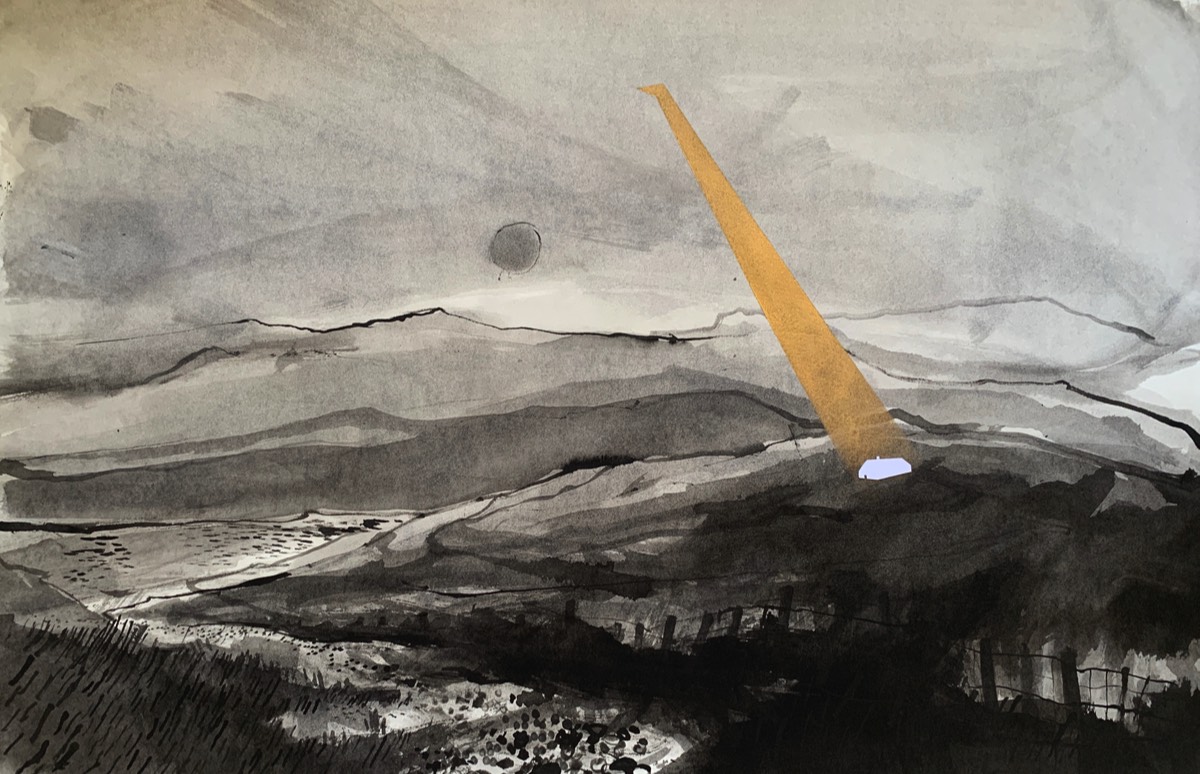 My drawings are developed in the studio from en-plein air pieces. I work in the field, assimilating as much information as possible, be in geography, atmosphere or weather. Once back in the studio I scale up my preliminary drawings and being to add abstract architectural design elements, to add tension and narrative to my work. I use a variety of mediums: from ink, charcoal and carbon powder, gold paste to collage alongside a selection of different erasers and 'rubbing back' methods.