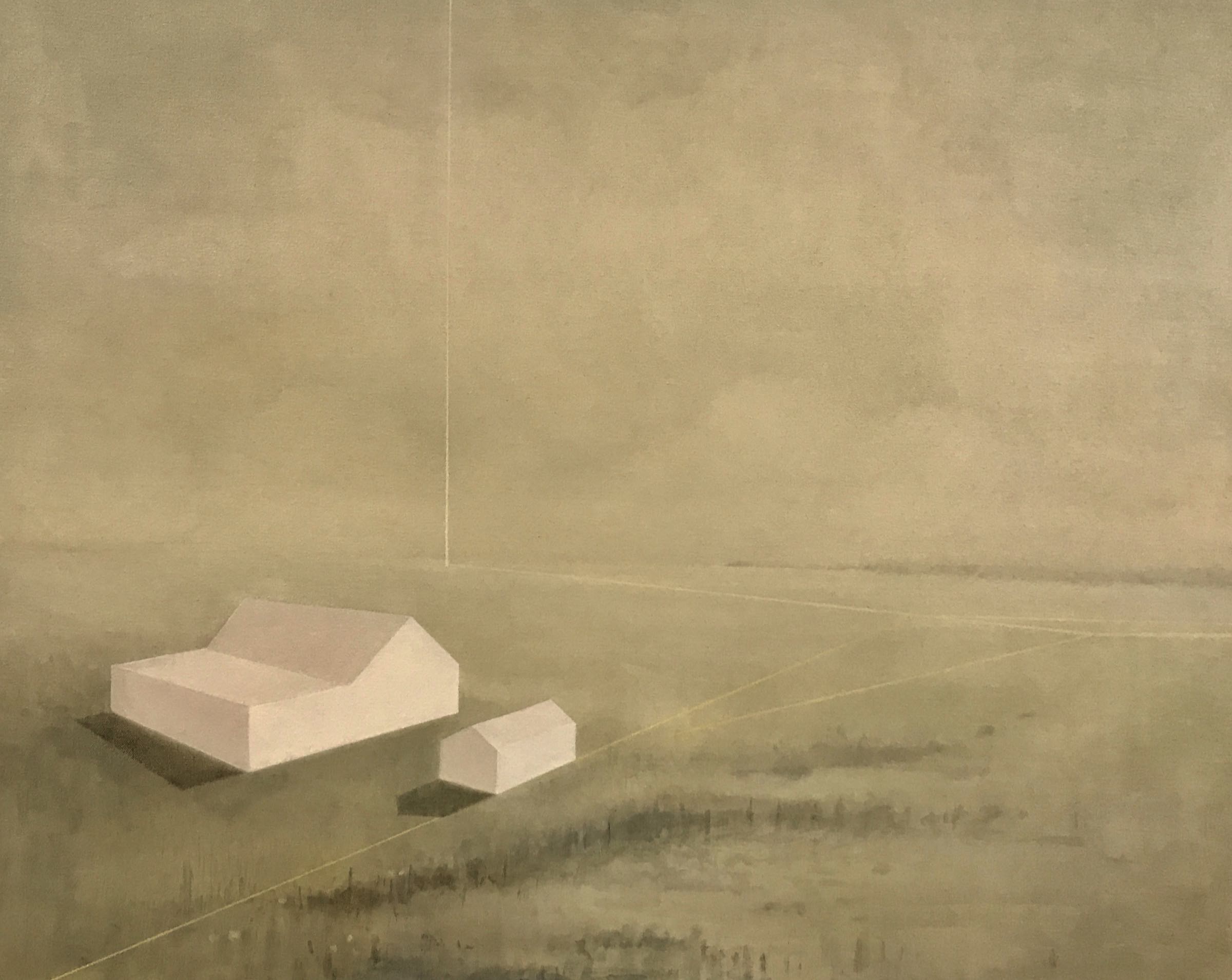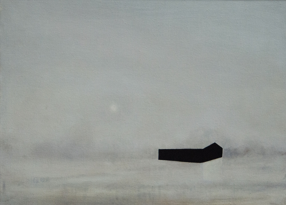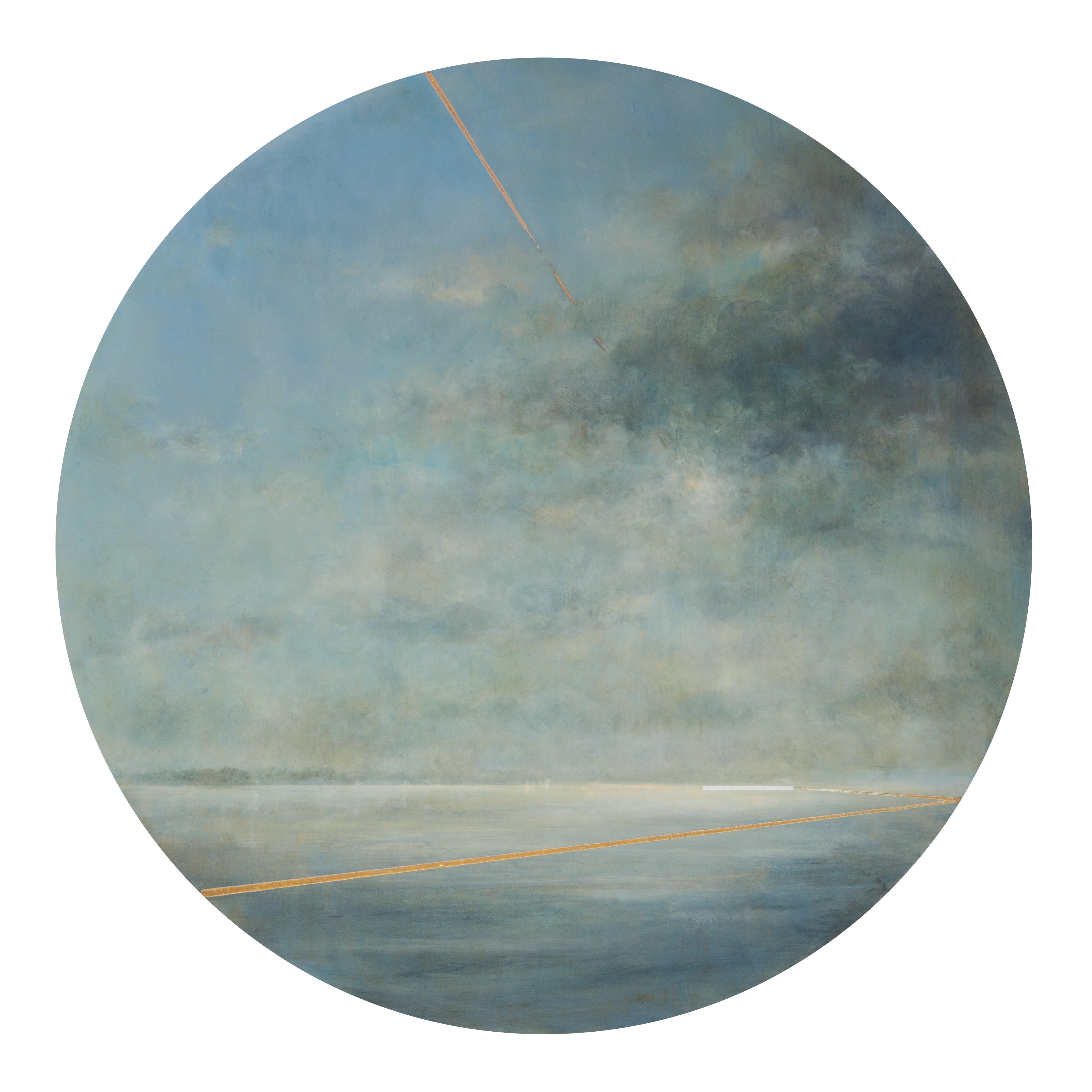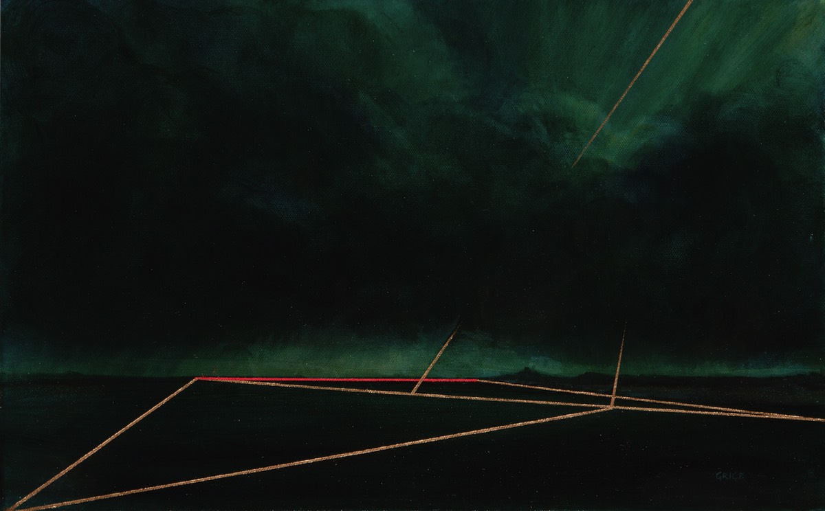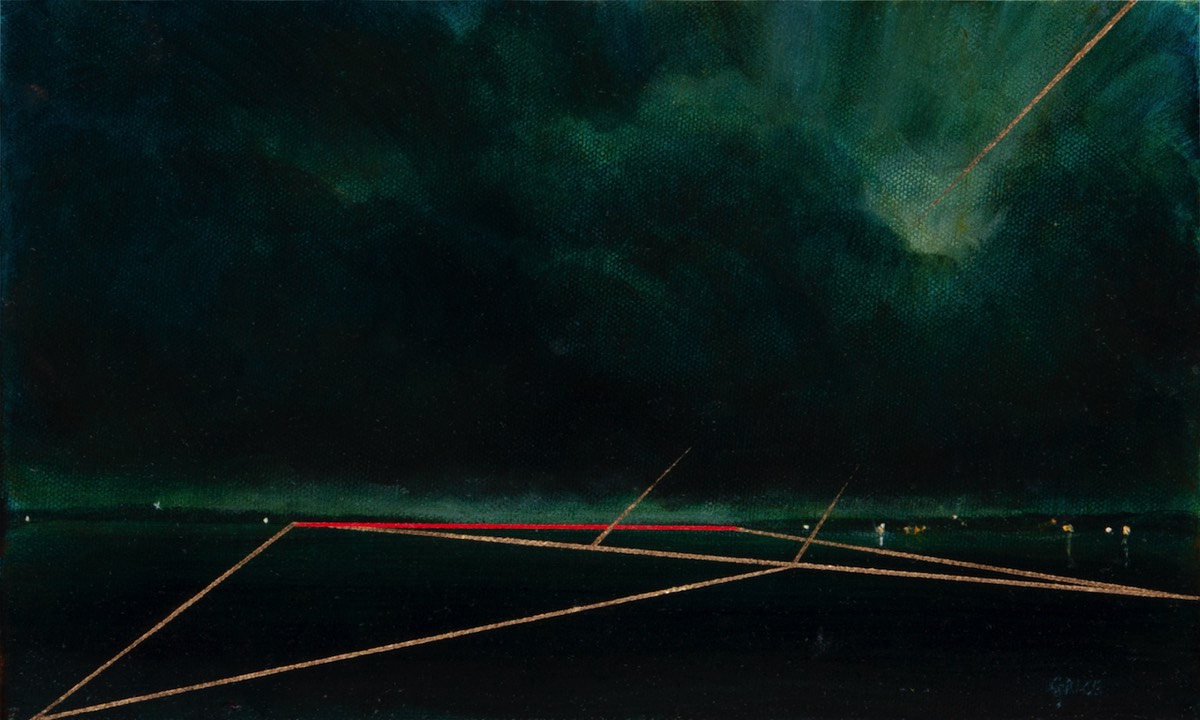 On closer viewing I create a disturbance and gentle provocation with the addition of incongruous graphic forms. These forms can take the shape of golden lines, scarlet tee sections and quadrilaterals. The geometric shapes within the paintings are used as a device that not only creates a visual dissonance but asks questions of the viewer.