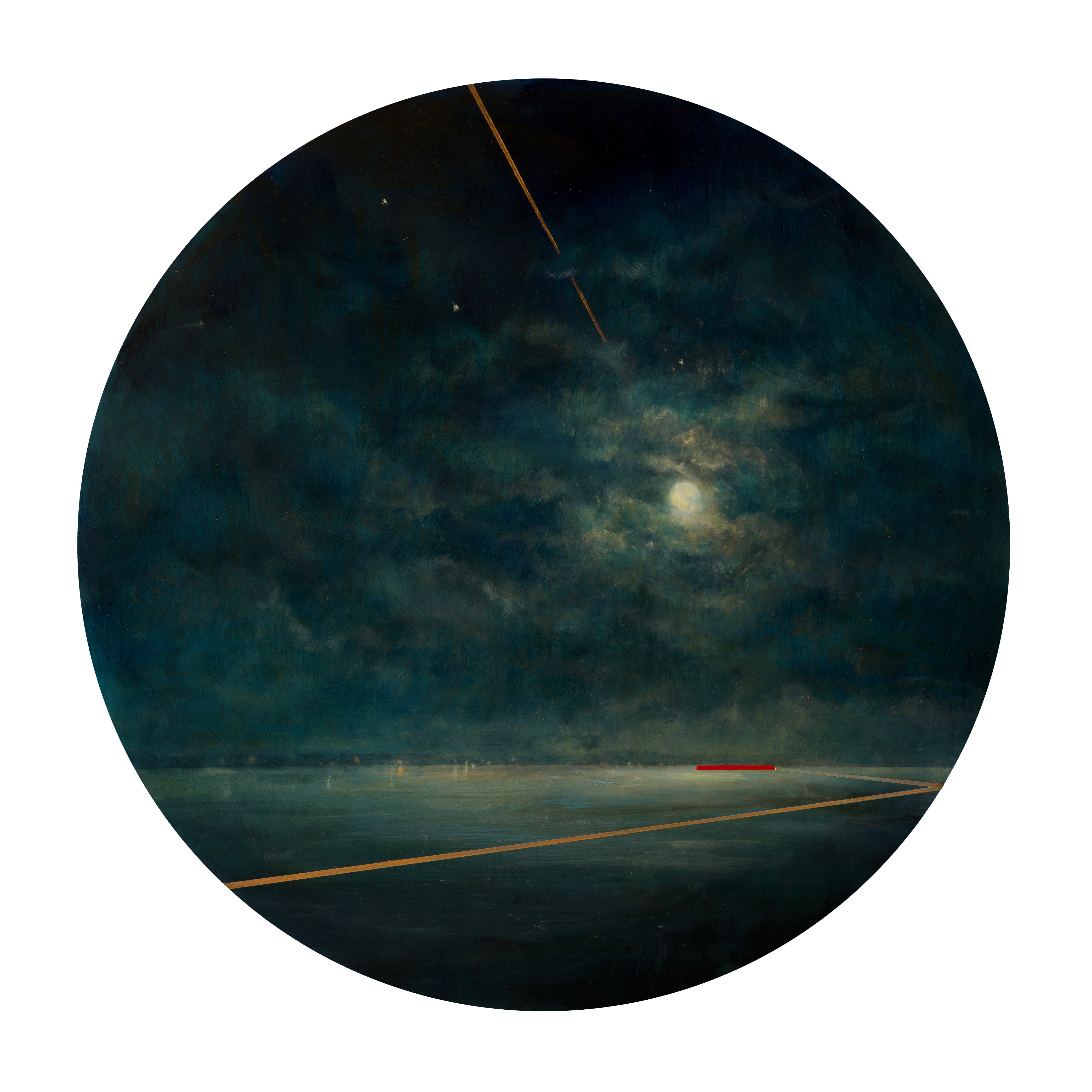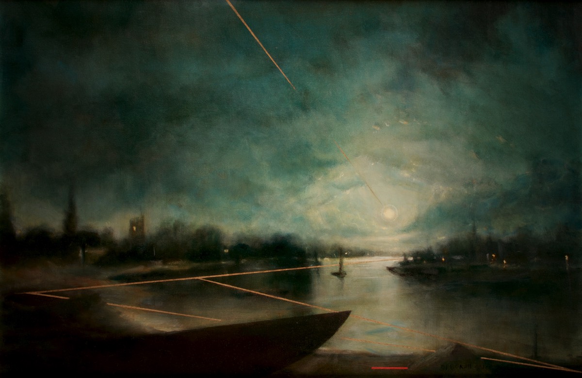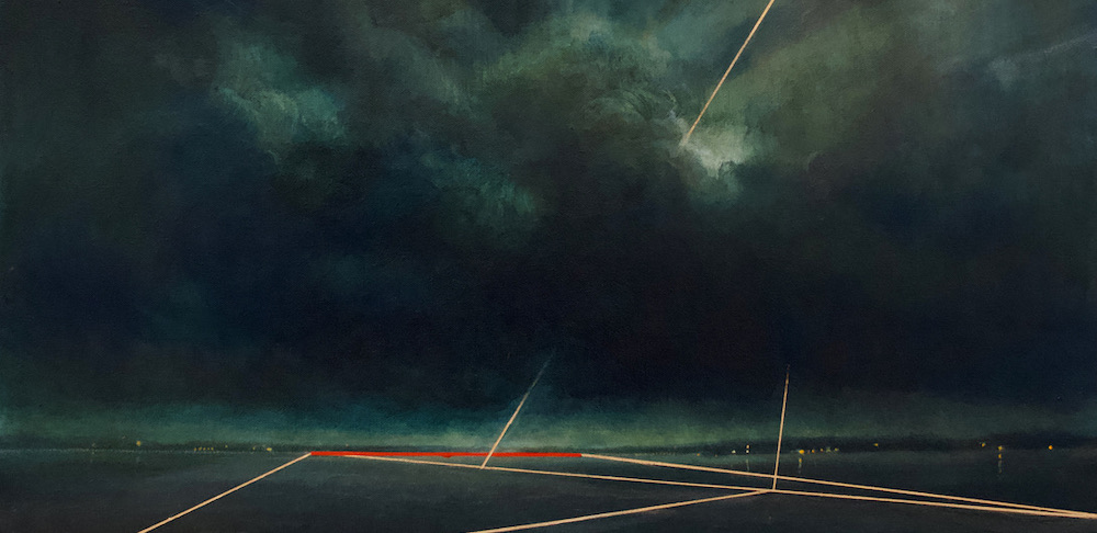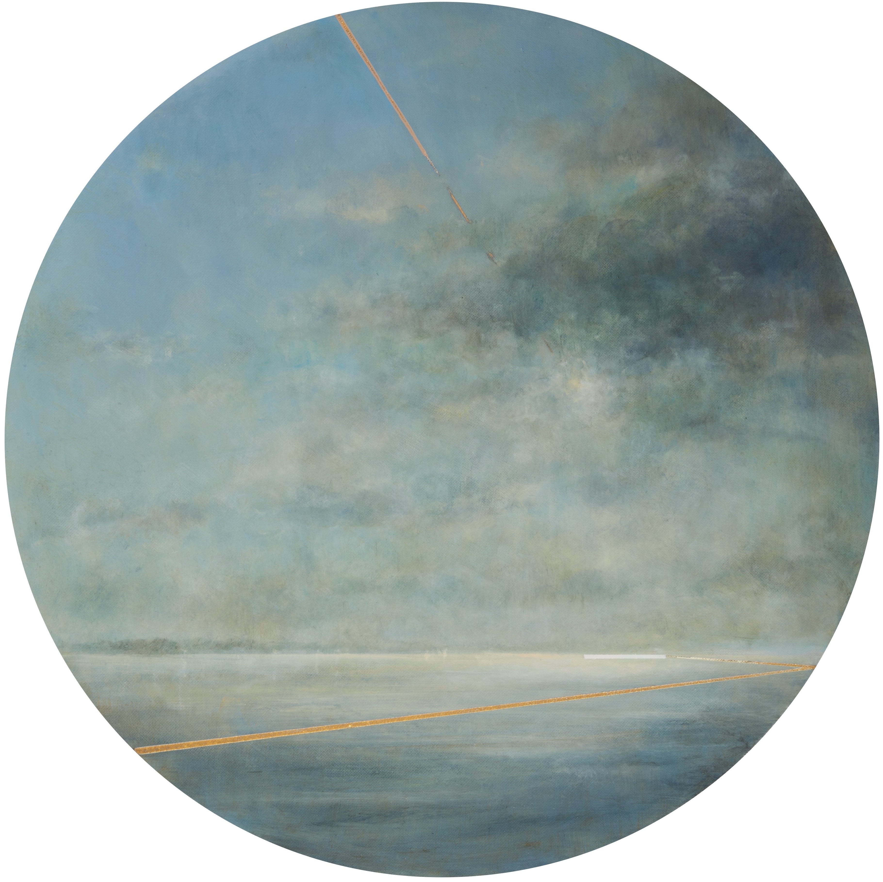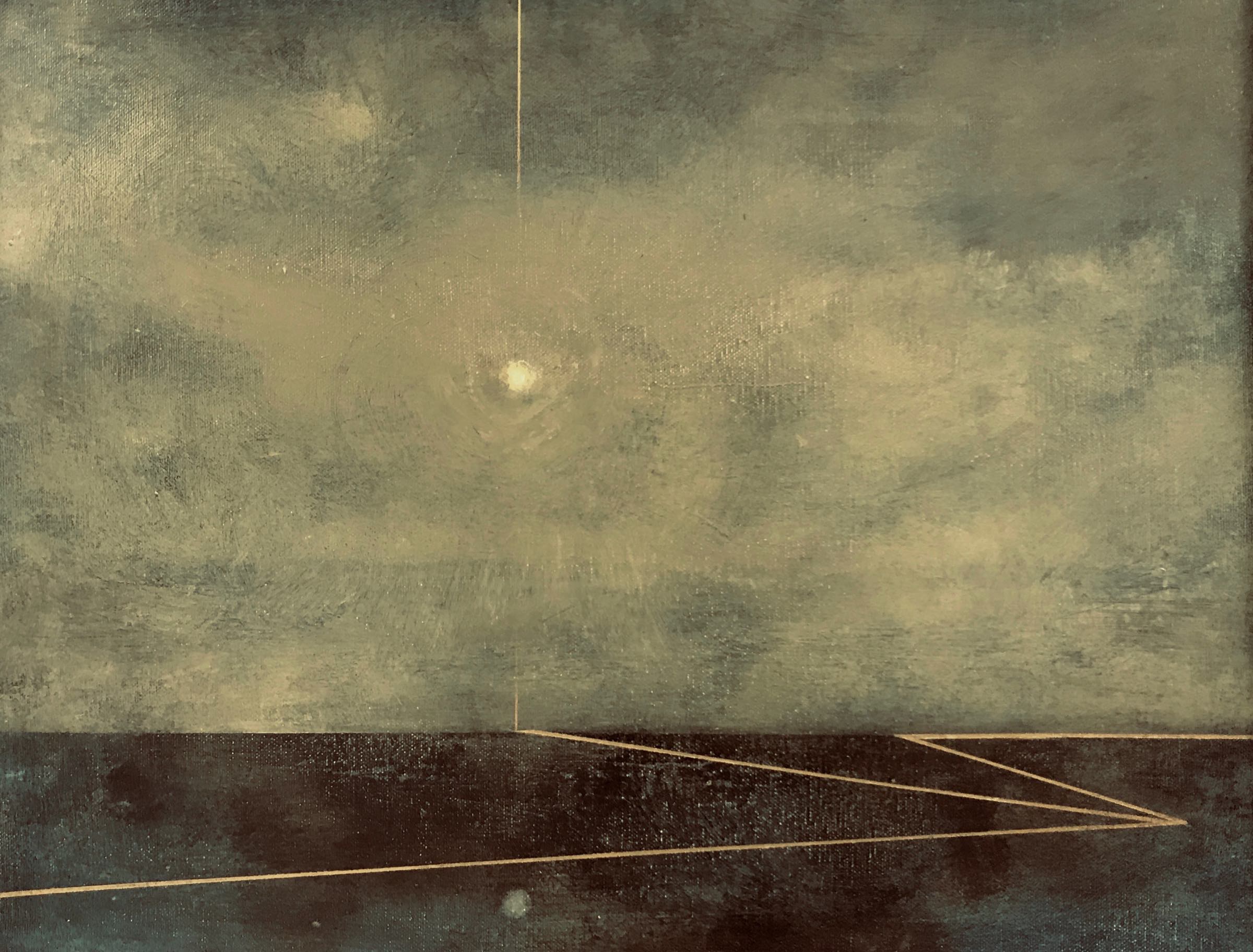 On closer viewing I create a disturbance and gentle provocation with the addition of incongruous graphic forms. These forms can take the shape of golden lines, scarlet tee sections and quadrilaterals. The geometric shapes within the paintings are used as a device that not only creates a visual dissonance but asks questions of the viewer.