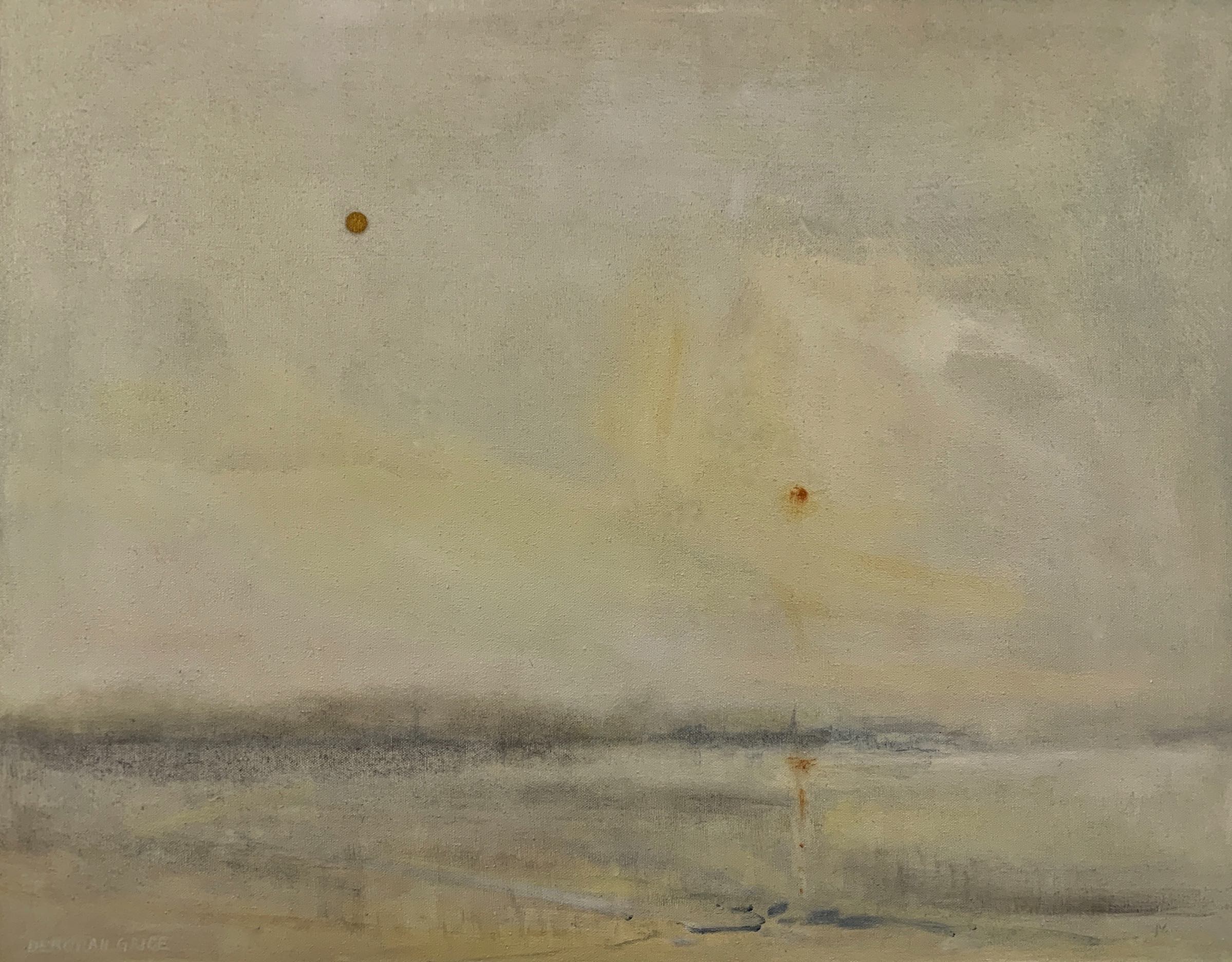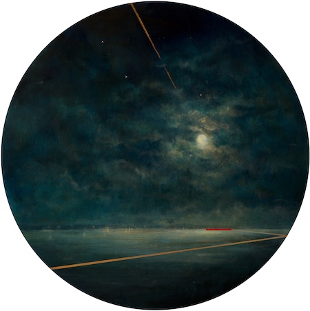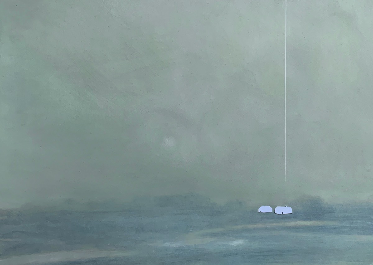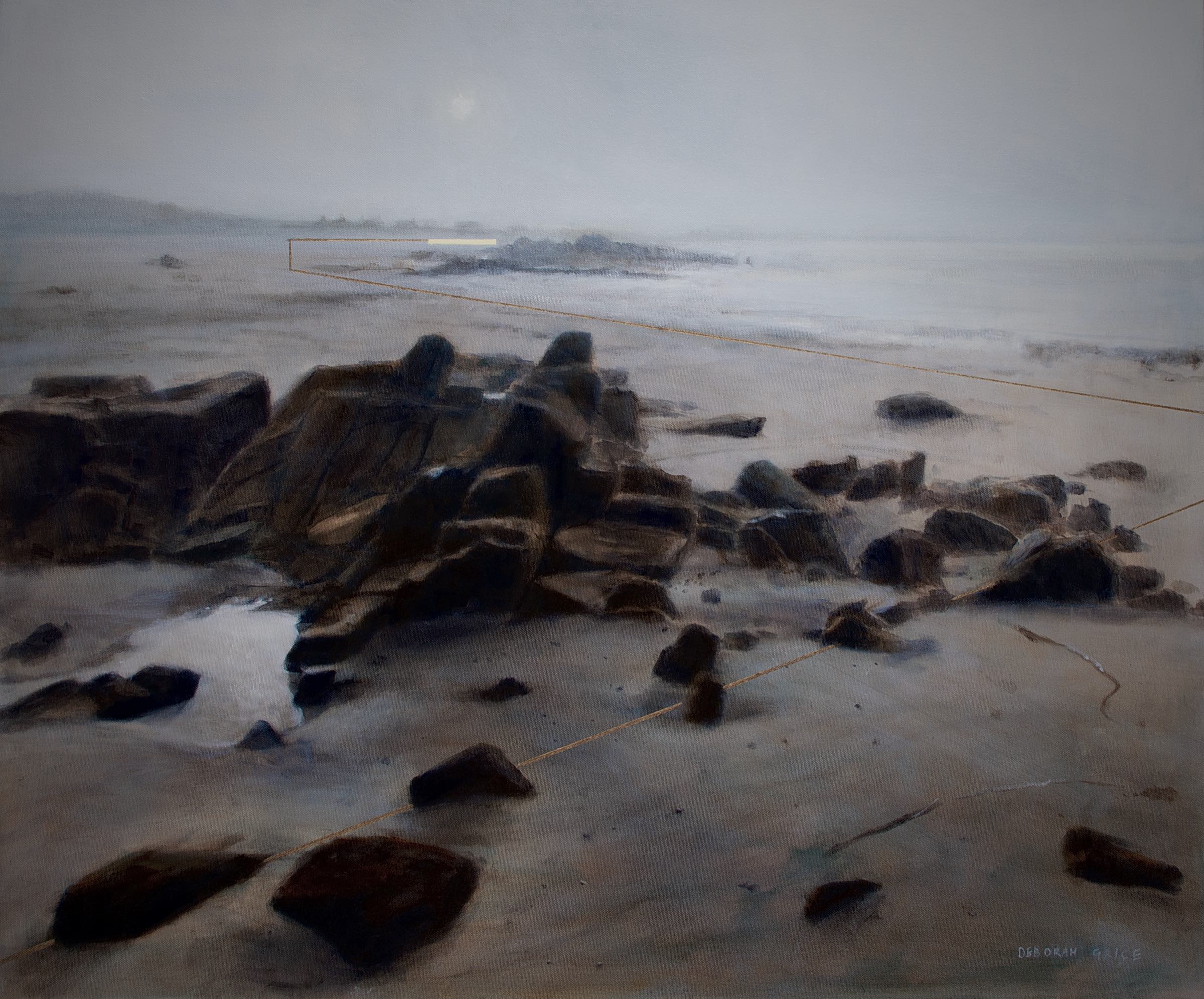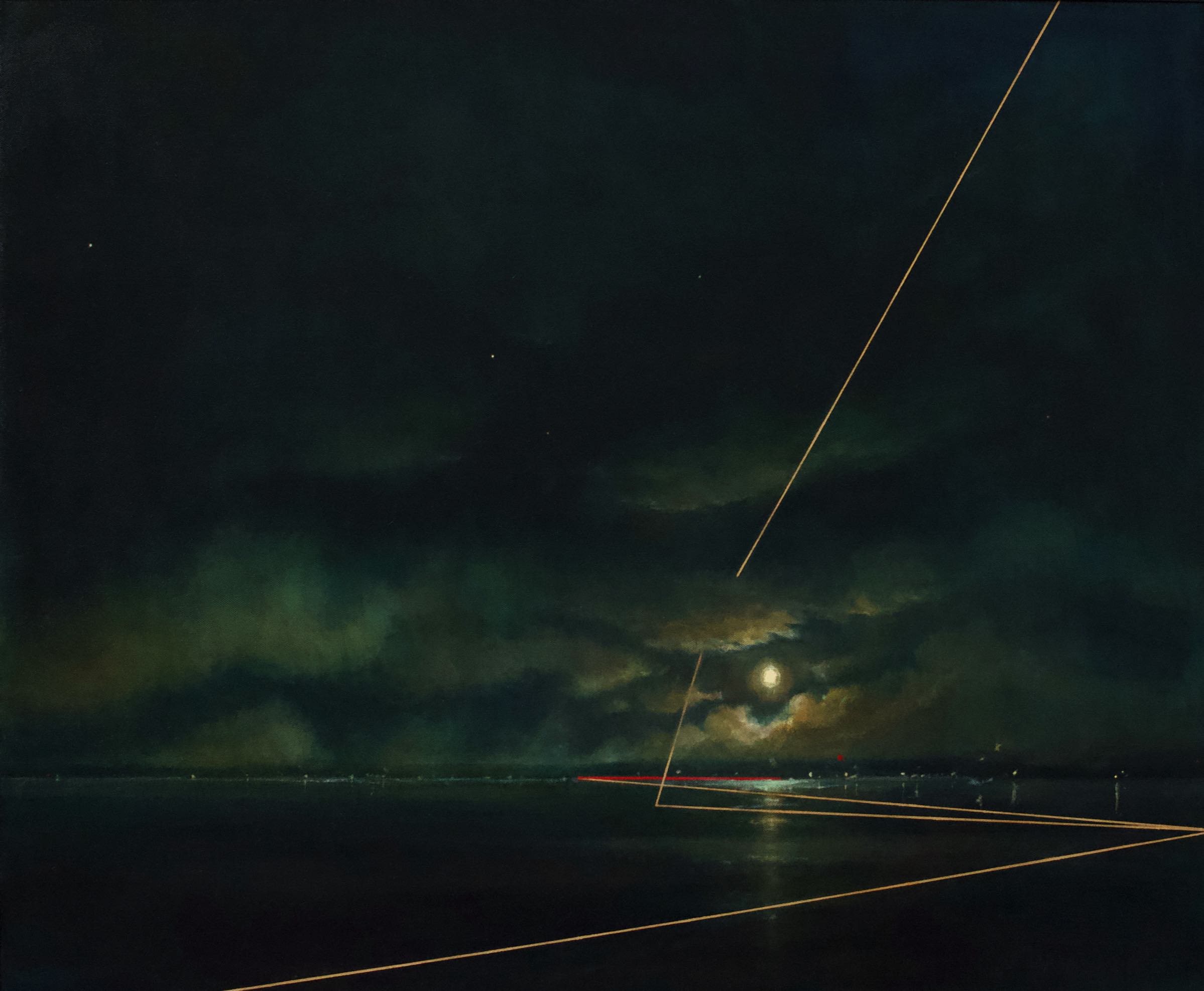 On closer viewing I create a disturbance and gentle provocation with the addition of incongruous graphic forms. These forms can take the shape of golden lines, scarlet tee sections and quadrilaterals. The geometric shapes within the paintings are used as a device that not only creates a visual dissonance but asks questions of the viewer.