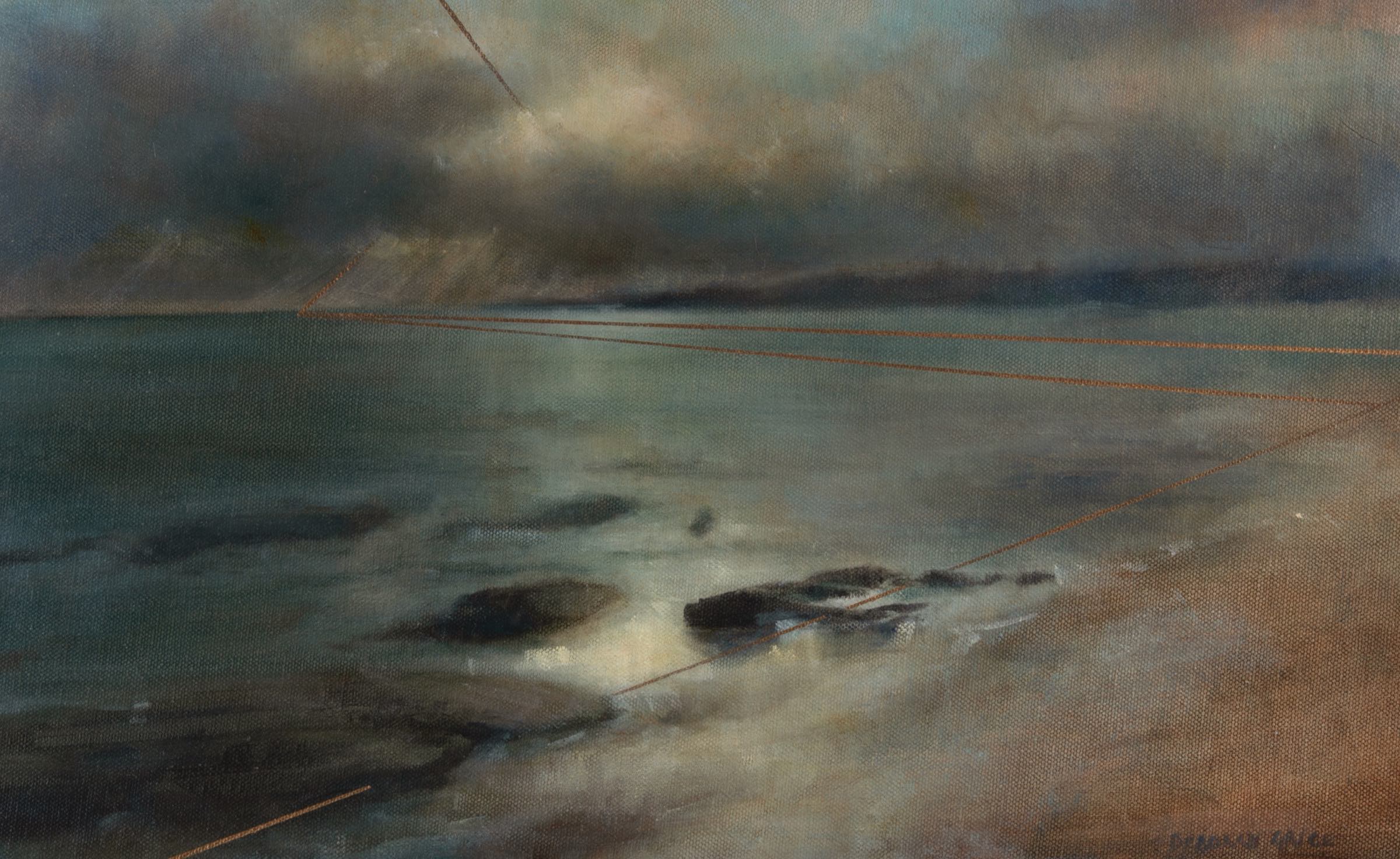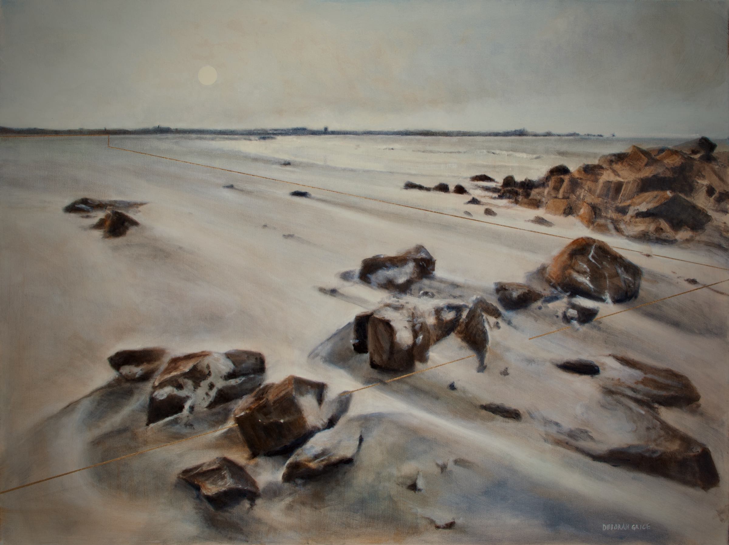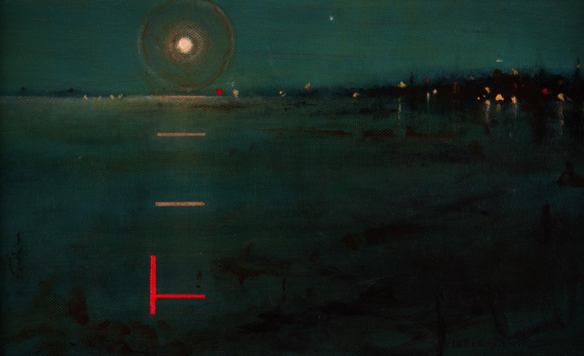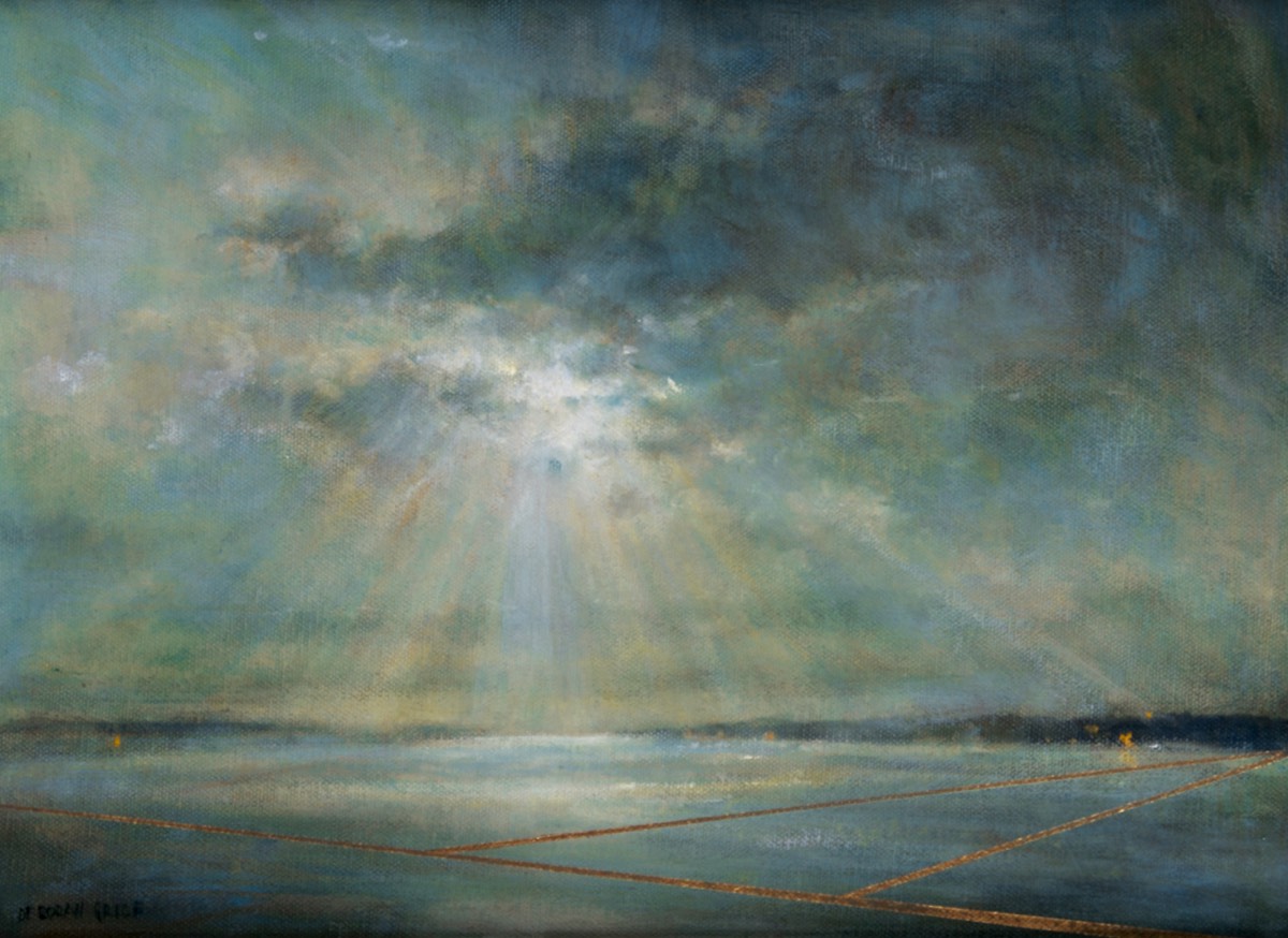 On closer viewing I create a disturbance and gentle provocation with the addition of incongruous graphic forms. These forms can take the shape of golden lines, scarlet tee sections and quadrilaterals. The geometric shapes within the paintings are used as a device that not only creates a visual dissonance but asks questions of the viewer.