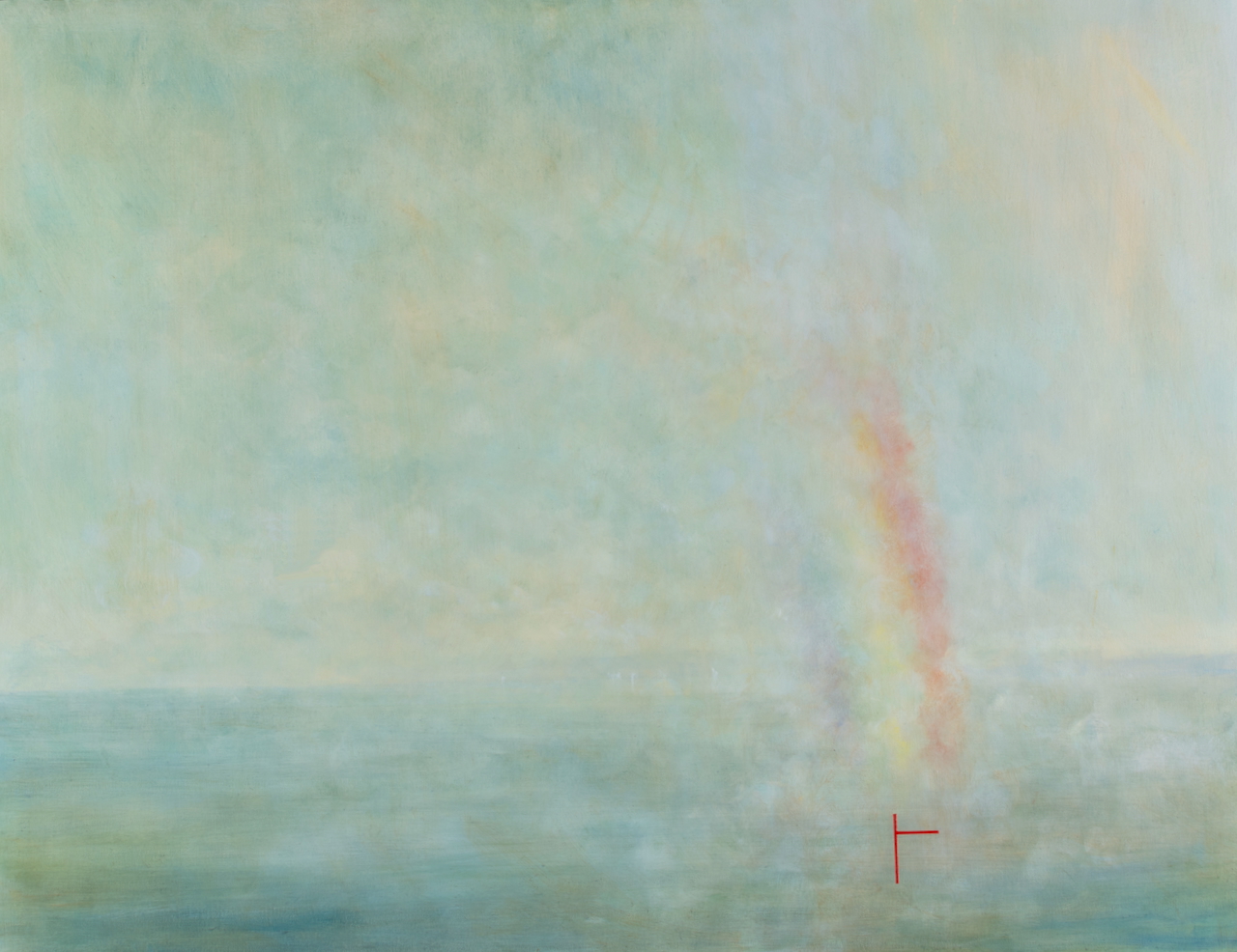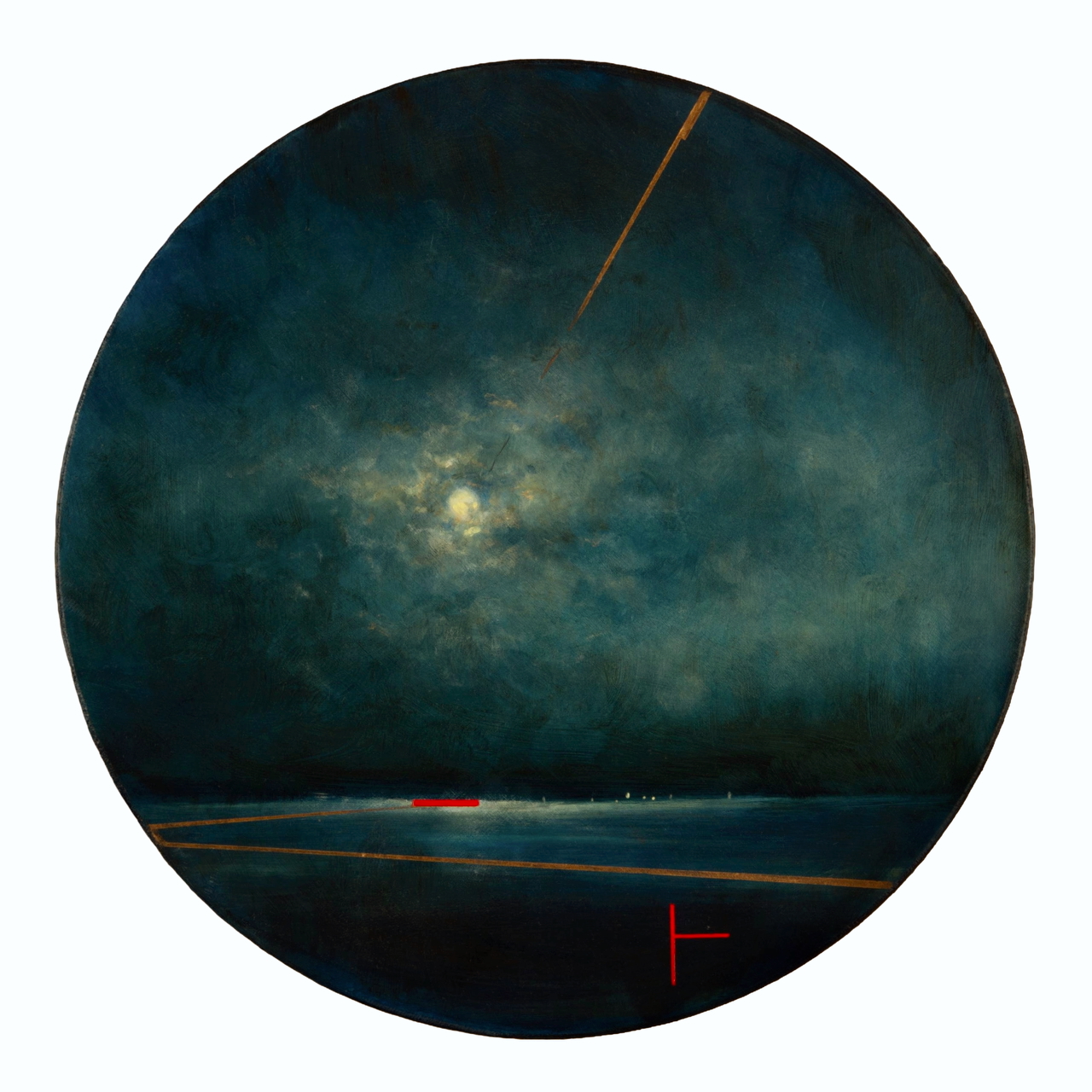 On closer viewing I create a disturbance and gentle provocation with the addition of incongruous graphic forms. These forms can take the shape of golden lines, scarlet tee sections and quadrilaterals. The geometric shapes within the paintings are used as a device that not only creates a visual dissonance but asks questions of the viewer.